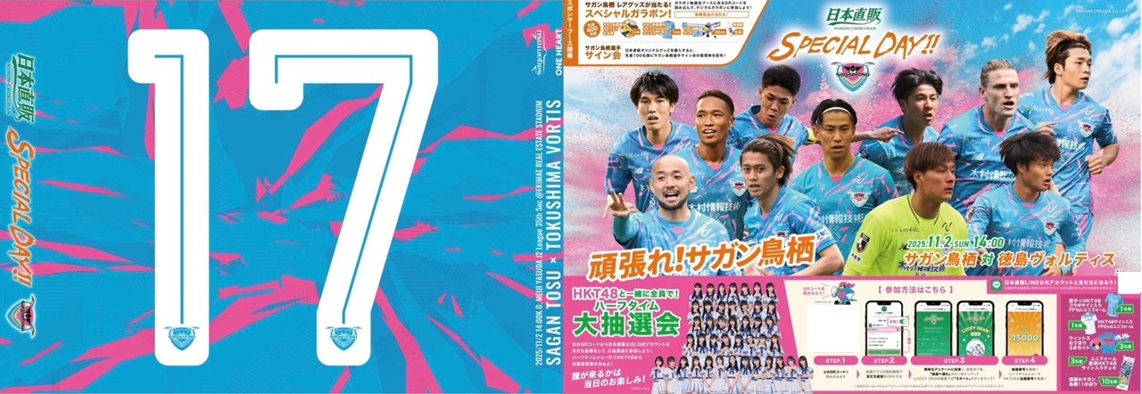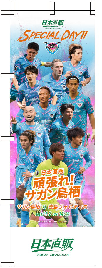 | 内容 | 日本直販SPECIAL DAY!!を記念して、サガン鳥栖コラボのぼりを掲出します!スタジアム内、外で掲出予定です。![]() |