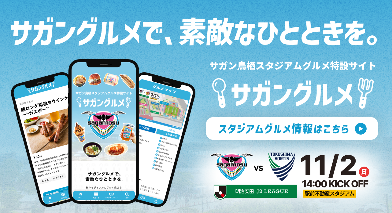 | 対象試合 | 11/2(日)2025明治安田J2リーグ 第35節 サガン鳥栖vs 徳島ヴォルティス 14:00キックオフ/駅前不動産スタジアム |